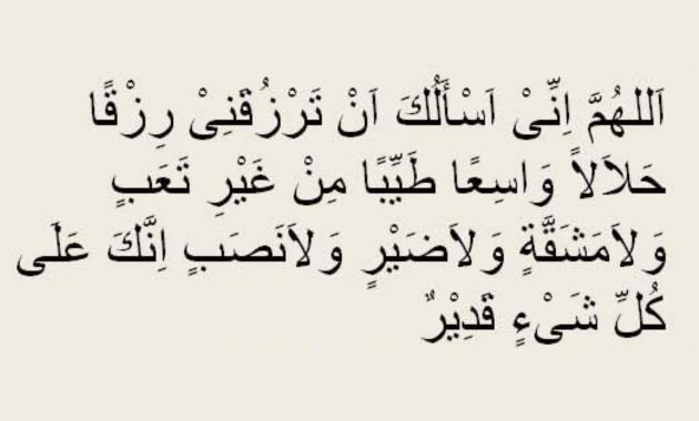 Allahumma innii as aluka an tarzuqanii rizqan halaalan waasi’an thayyiban min ghairita’abin wala masyaqqatin walaa dhoirin wa laa nashabin innaka ‘alaa kulli syai in qadiir.